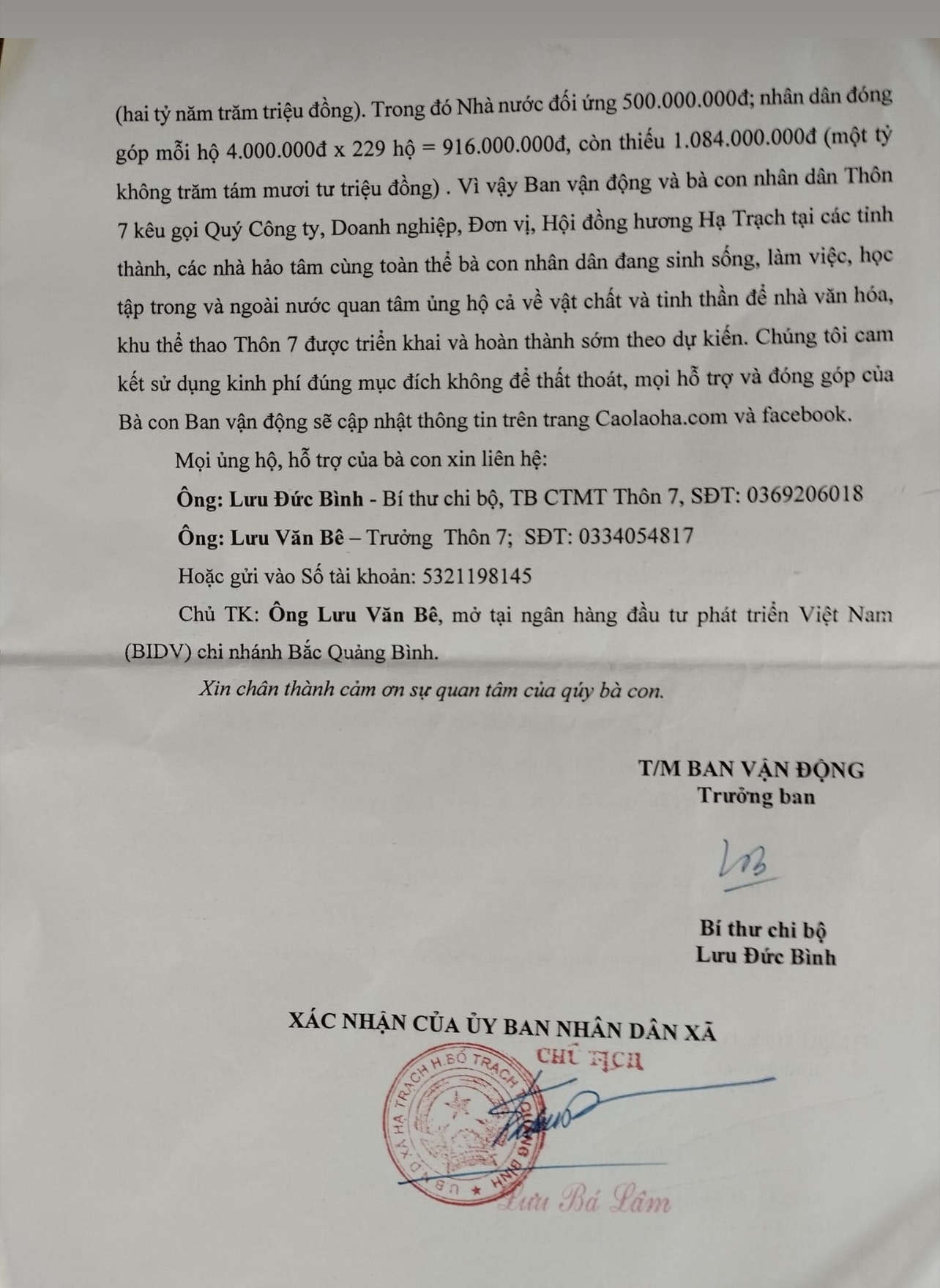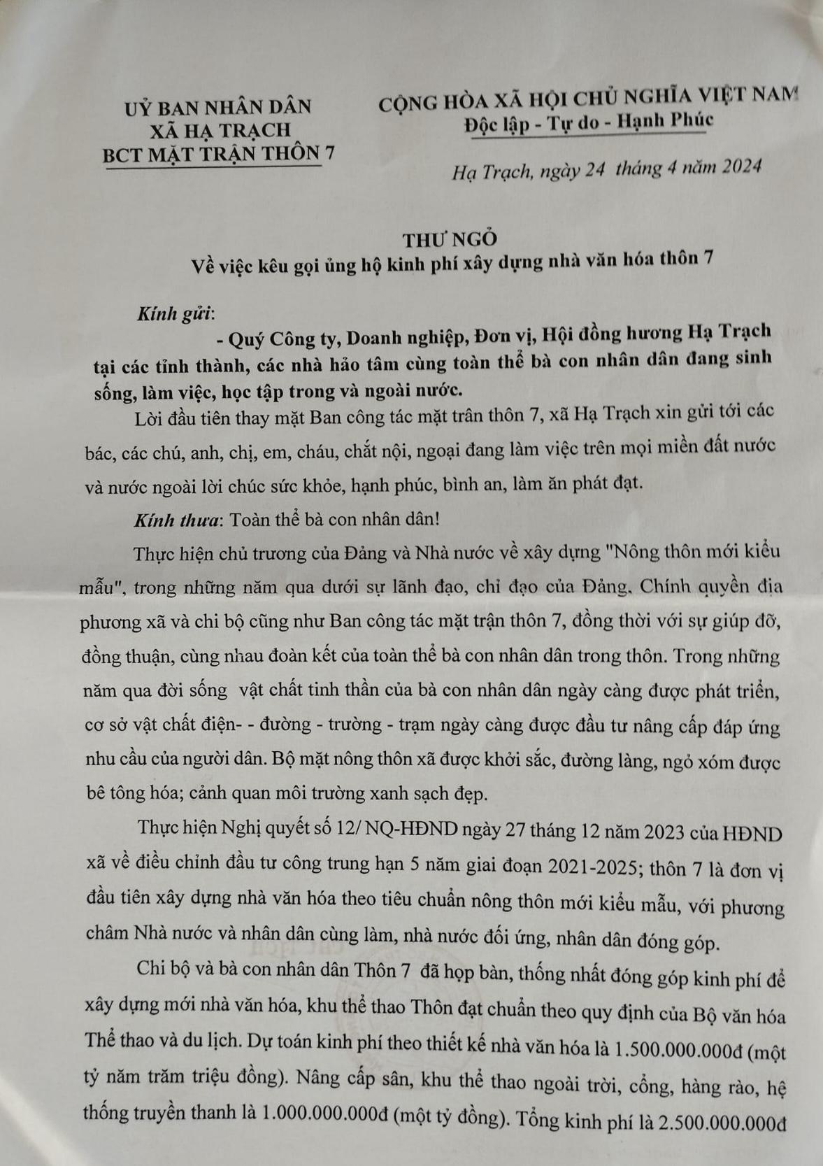 Thư kêu gọi ủng hộ kinh phí xây dựng nhà văn hóa thôn 713:53 - 06/06/2024 Thư kêu gọi ủng hộ kinh phí xây dựng nhà văn hóa của Ban công tác mặt trận thôn 7 Tác giả: Thôn 7Chia sẻ: