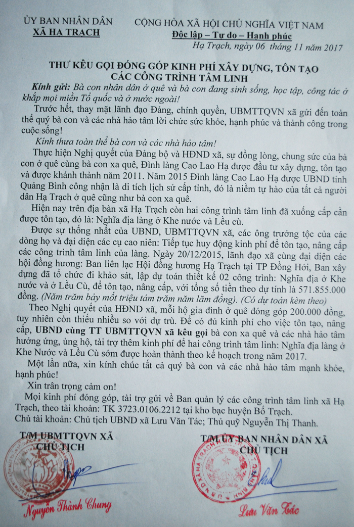 Kính mong bà con hưởng ứng thư kêu goi để sớm hoàn thành công trình tâm linh của quê hương.