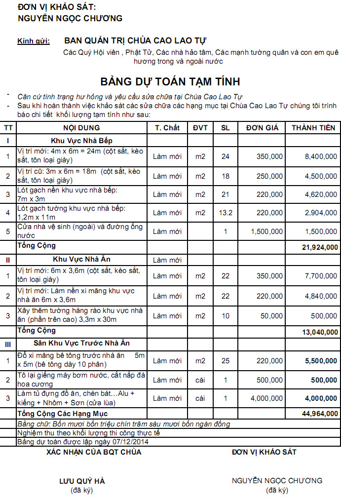 Dự toán tổng kinh phí thực hiện các hạng mục trên khoảng 43 triệu đồng. Qũy chùa hiện nay không còn do vậy Nhà chùa kêu gọi các Quý Hội viên, Phật tử, các nhà hảo tâm và con em quê hương trong và ngoài nước phát tâm công đức đóng góp kinh phí để chùa sớm hoàn thiện các hạng mục trước ngày họp Hội Đồng Hương cuối năm - Lễ cúng Rằm Tháng Giêng năm 2015.