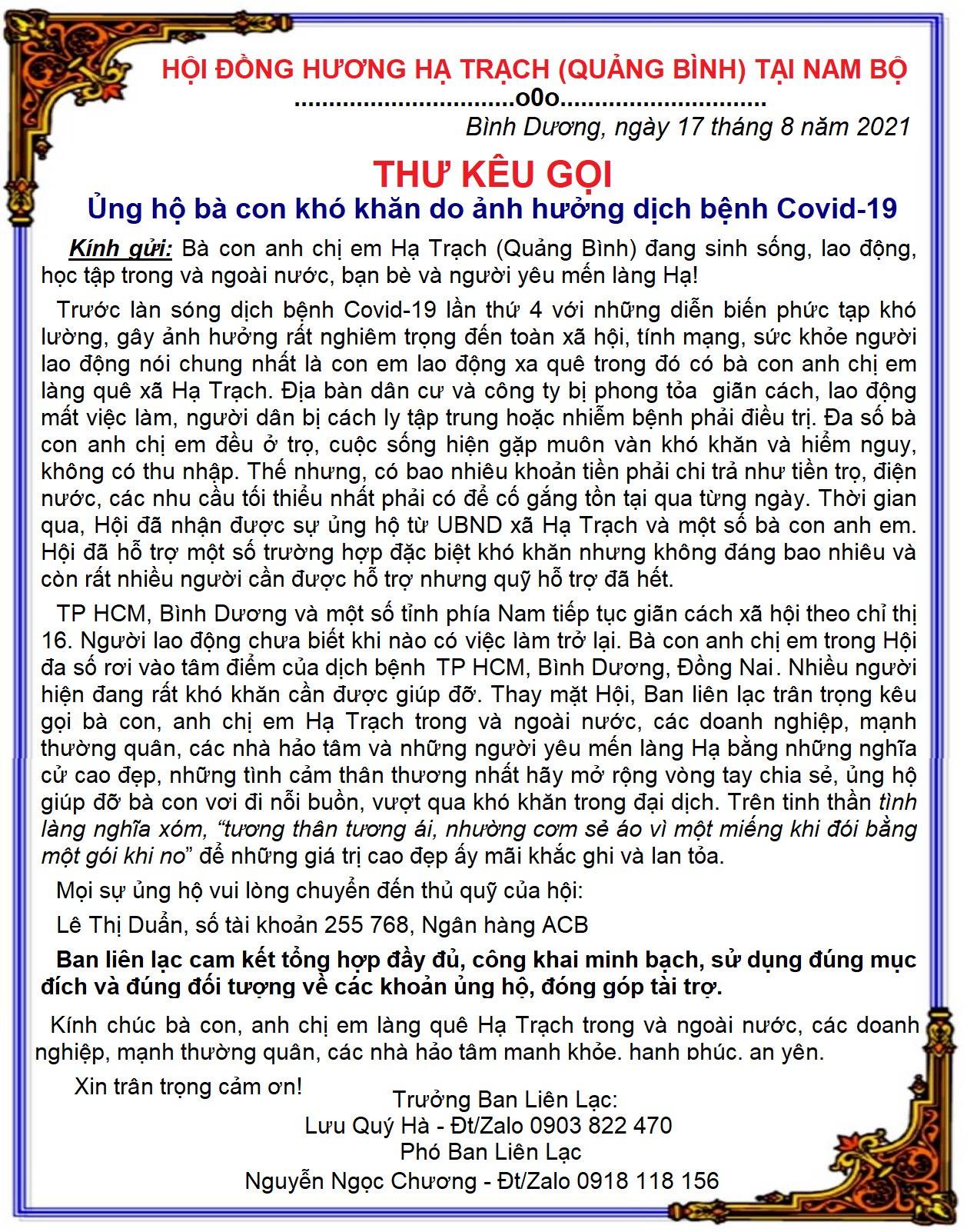 Thư kêu gọi17:41 - 18/08/2021 Thư của kêu gọi ủng hộ bà con khó khăn do ảnh hưởng của dịch Covid 19 của Hội đồng hương Hạ Trạch tại khu vực Nam Bộ Tác giả: Lưu Quý HàChia sẻ: