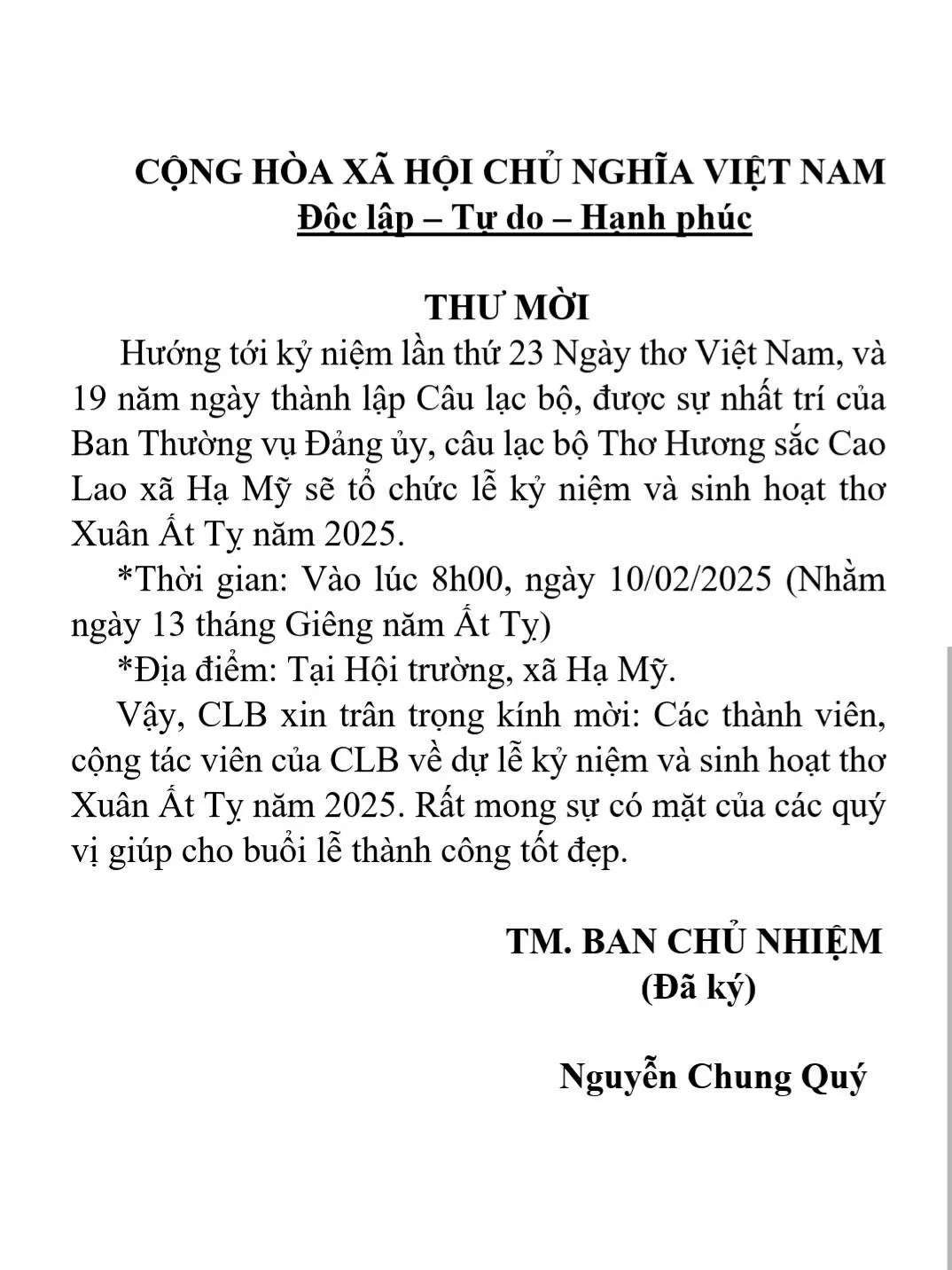 Thư mời của Câu lạc bộ Hương sắc Cao Lao10:53 - 09/02/2025 Thư của Câu lạc bộ Hương sắc Cao Lao mời dự lễ kỷ niệm 23 năm ngày thơ Việt Nam và sinh hoạt thơ xuân Ất Tỵ 2025 Tác giả: Nguyễn Chung QuýChia sẻ: