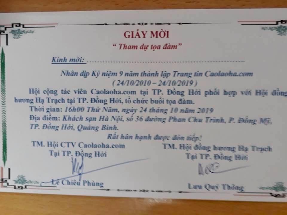 Thư mời dự tọa đàm nhân kỷ niệm 9 năm thành lập trang tin caolaoha.com của Hội đồng hương Hạ Trạch và Hội cộng tác viên caolaoha.com tại Tp. Đồng Hới.