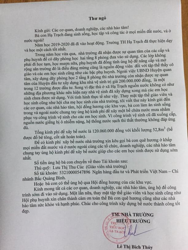 Thư ngỏ của Trường tiểu học Hạ Trạch15:14 - 09/09/2019 Thư ngỏ của trường tiểu học Hạ Trạch kêu gọi hỗ trợ kinh phí xây dựng bể nước cho các cháu học sinh Tác giả: Ban biên tậpChia sẻ: