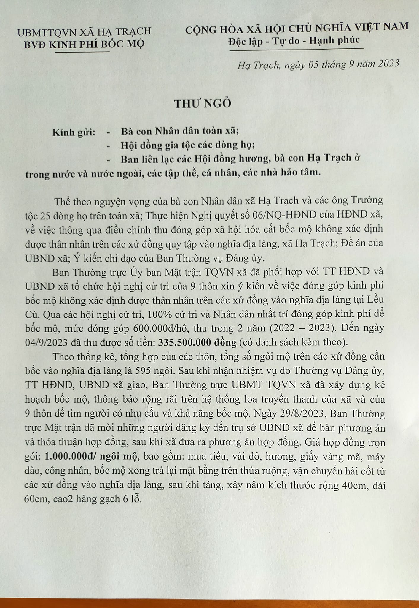 Thư ngỏ của UBMTTQ Việt Nam xã Hạ Trạch14:57 - 19/09/2023 Thư của UBMTTQ Việt Nam xã Hạ Trạch về việc kêu gọi đóng góp kinh phí di dời các ngôi mộ chưa xác định được thân nhân về nghĩa địa làng Tác giả: Nguyễn Thành ChungChia sẻ:
