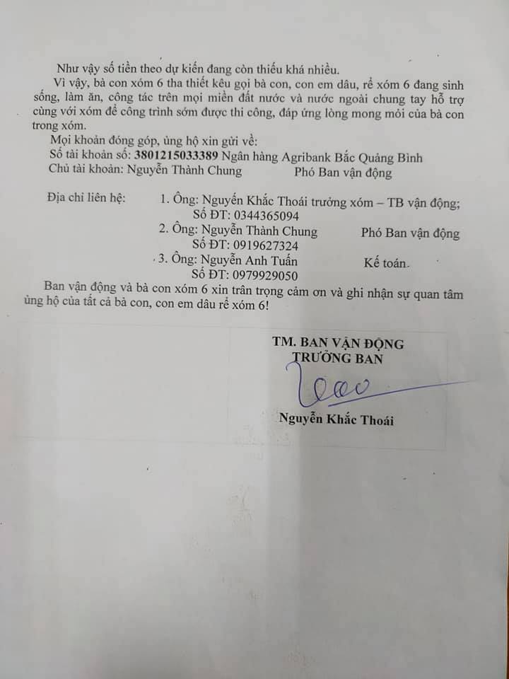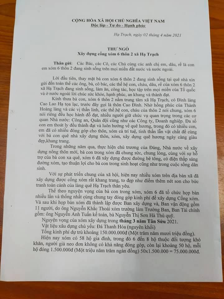 Thư của Ban vận động xây dựng xây dựng cổng chào xóm 6, Thôn 2, xã Hạ Trạch