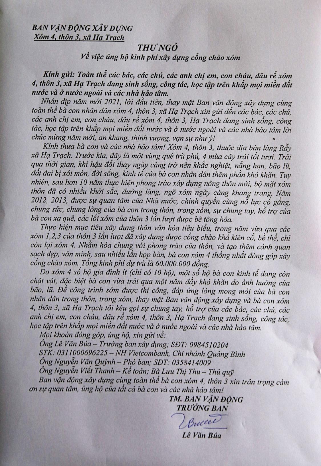 Thư của Ban vận động xây dựng xây dựng cổng chào xóm 4, Thôn 3, xã Hạ Trạch