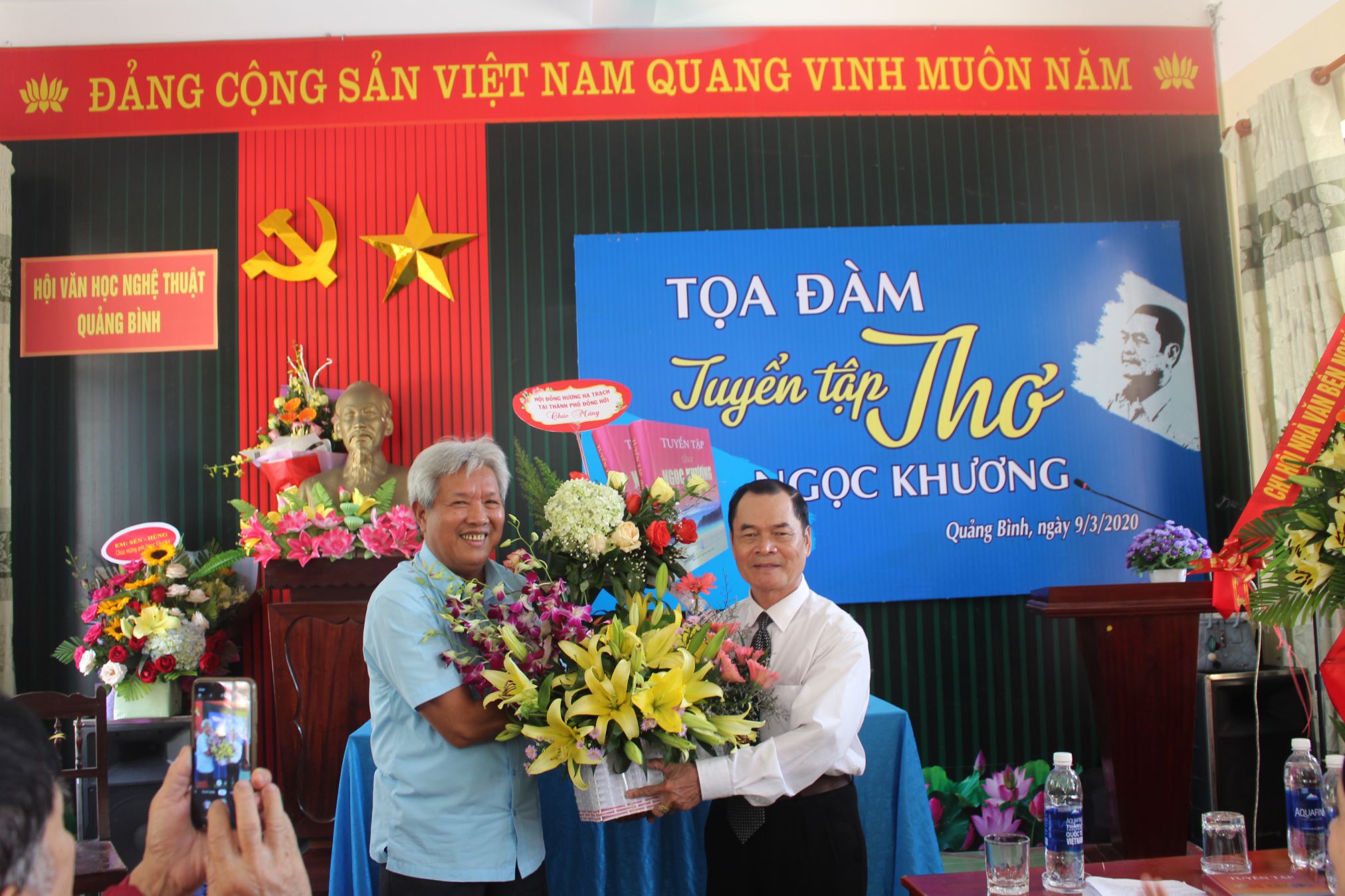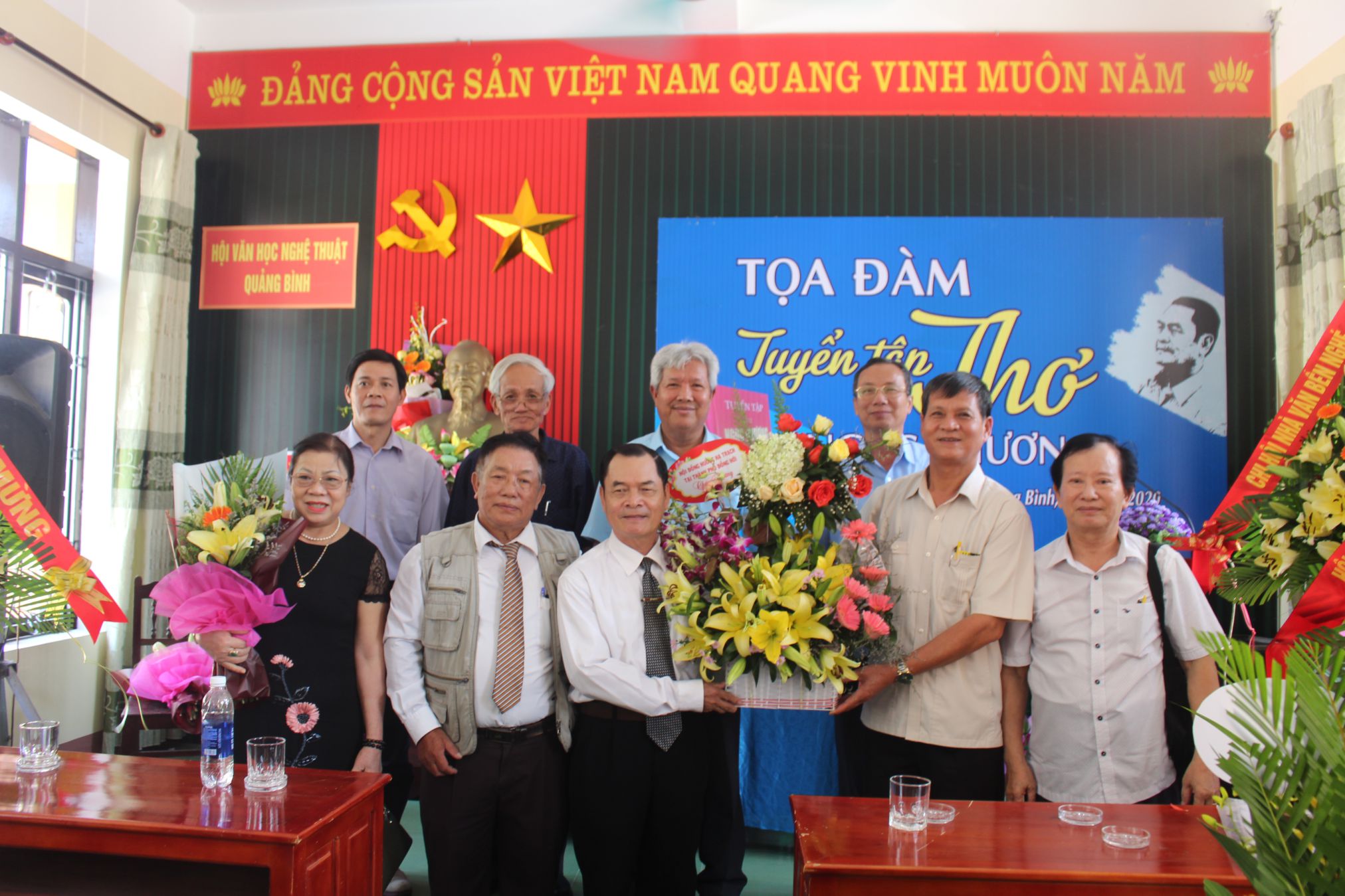 Gần 100 hội viên hội VHNT Quảng Bình, Thừa Thiên Huế, Tp Hồ Chí Minh...lãnh đạo xã Quảng Lộc, xã Hạ Trạch, hội đồng hương Hạ Trạch, hội đồng hương xã Quảng Lộc tại TP Đồng Hới, bạn bè gần xa và bà con nội ngoại gửi lẵng hoa chúc mừng và tham dự buổi tọa đàm.