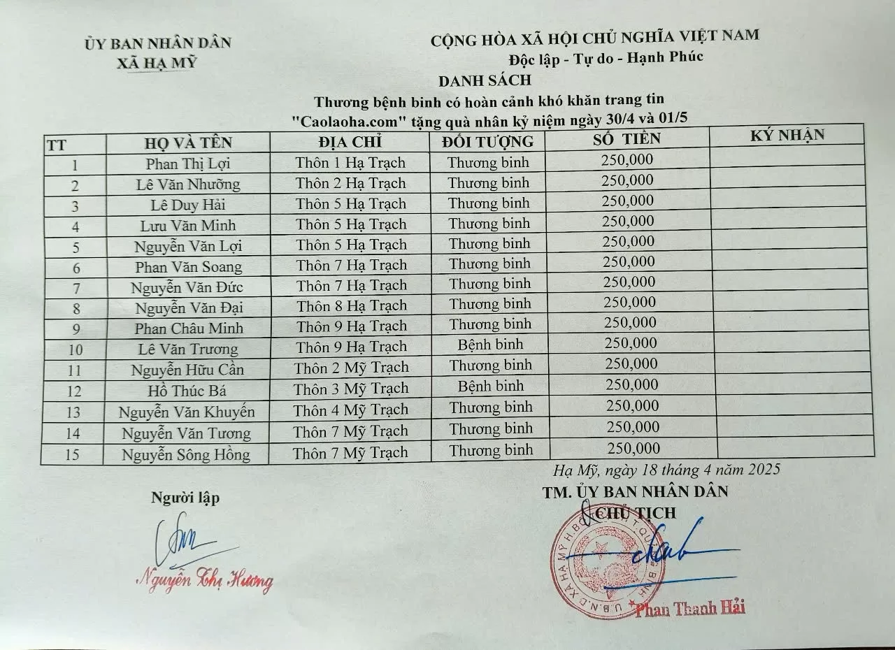 Nhân dịp này, trang tin xin được trao tặng 15 xuất quà, mỗi suất 250 ngàn đồng tới 15 gia đình thương bệnh binh có hoàn cảnh khó khăn, ốm đau, bệnh tật dài ngày của xã Hạ Mỹ theo danh sách do Ủy ban Mặt trận Tổ quốc Việt Nam xã Hạ Mỹ cung cấp.