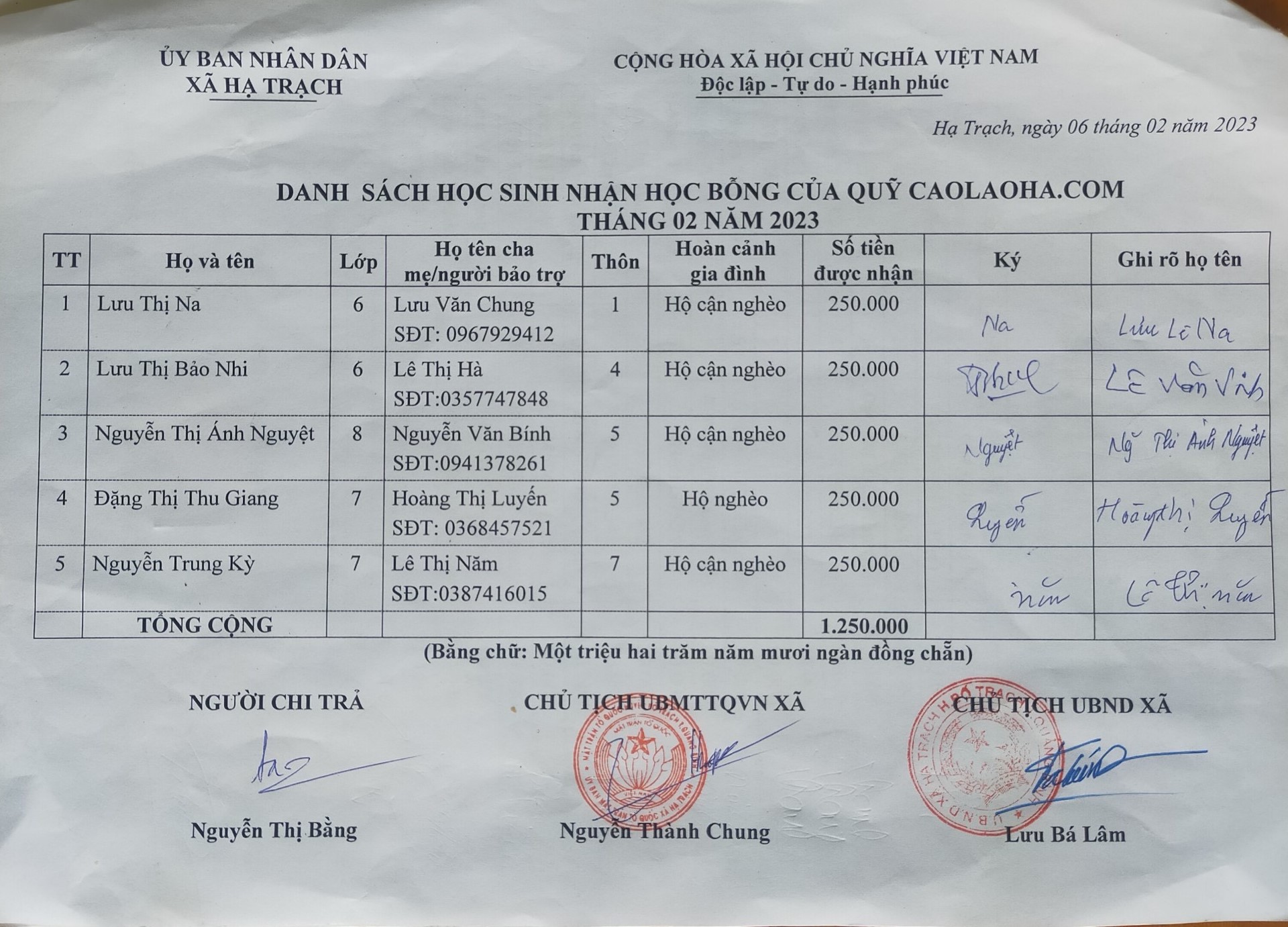 Trang tin caolaoha.com trao tiền tài trợ của tháng 2 năm 2023 cho 19 hộ nghèo (150.000đ/hộ/tháng) và cho 5 học sinh nghèo (250.000đ/học sinh/tháng) của làng Cao Lao Hạ.