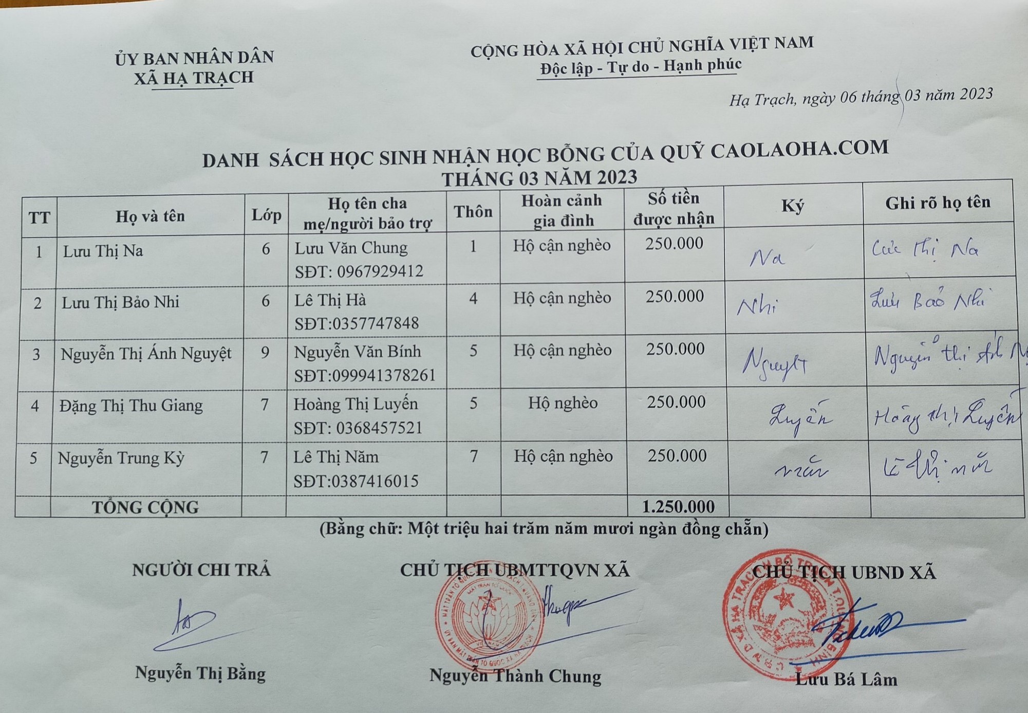 Trang tin caolaoha.com trao tiền tài trợ của tháng 3 năm 2023 cho 19 hộ nghèo (150.000đ/hộ/tháng) và cho 5 học sinh nghèo (250.000đ/học sinh/tháng) của làng Cao Lao Hạ.