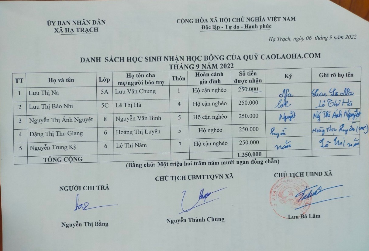Trang tin caolaoha.com trao tiền tài trợ của tháng 9 năm 2022 cho 19 hộ nghèo (150.000đ/hộ/tháng) và cho 5 học sinh nghèo (250.000đ/học sinh/tháng) của làng Cao Lao Hạ.