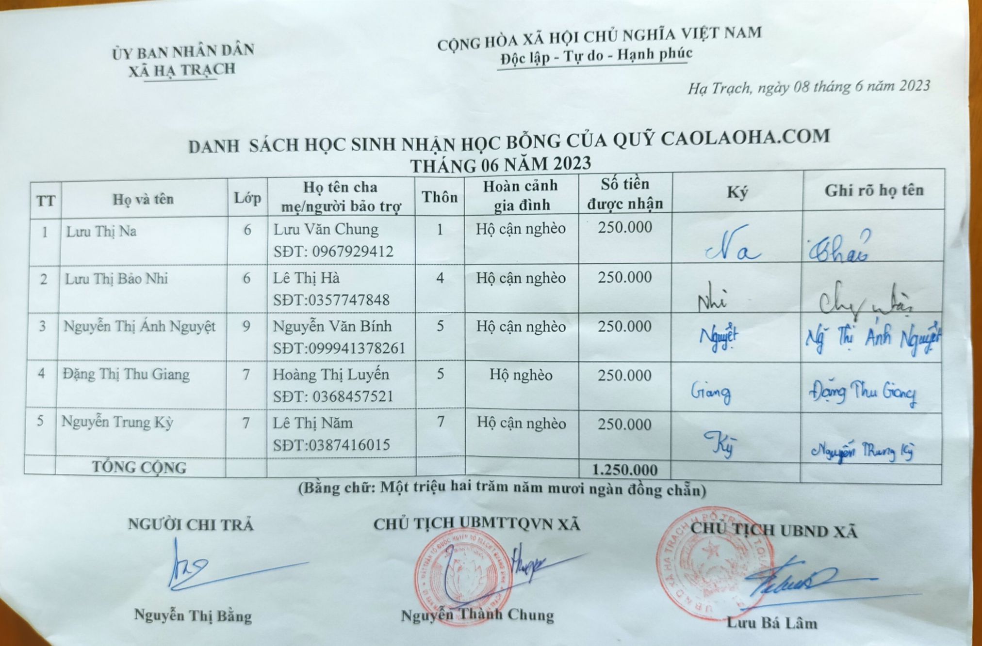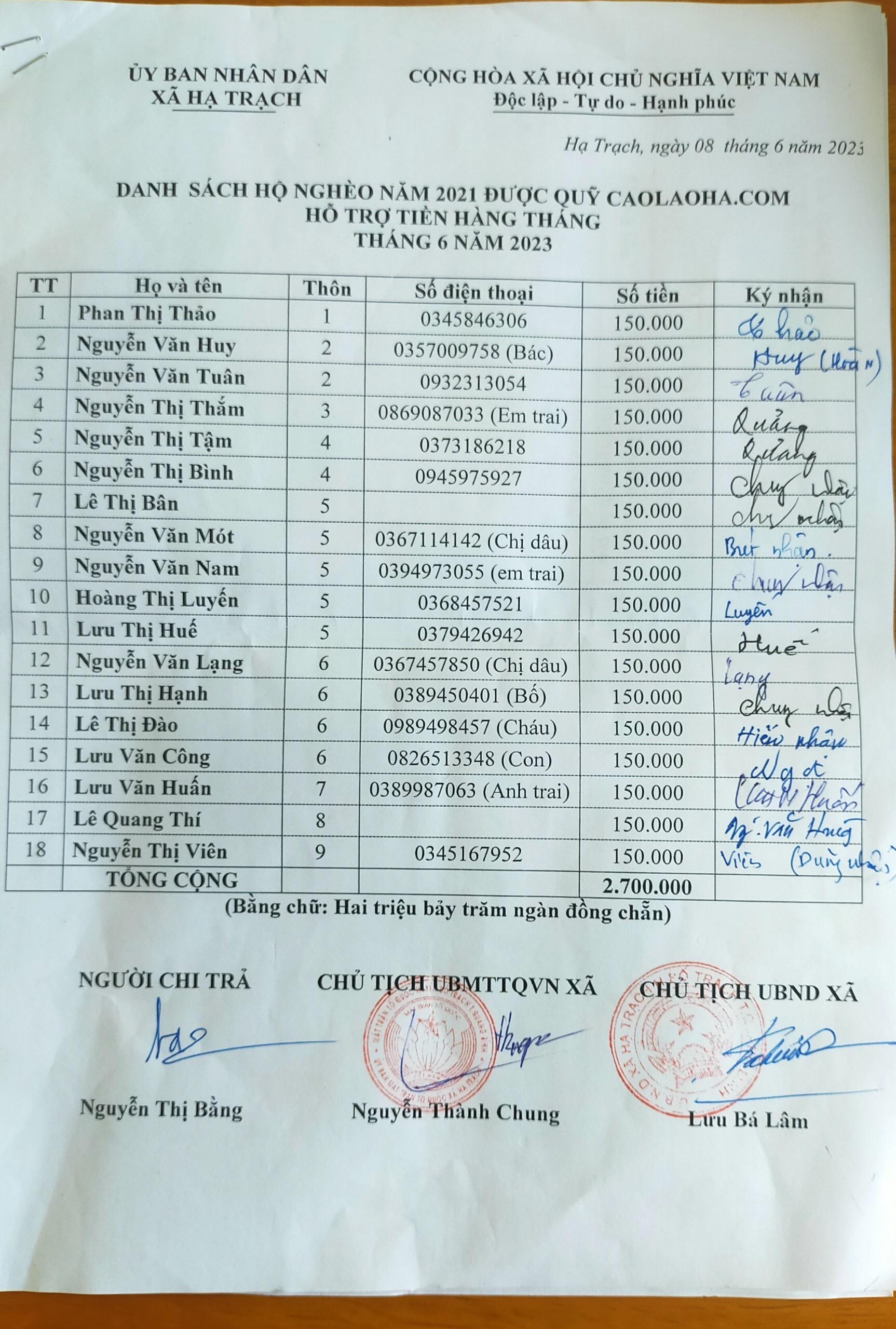 Trang tin caolaoha.com trao tiền tài trợ của tháng 6 năm 2023 cho 18 hộ nghèo (150.000đ/hộ/tháng) và cho 5 học sinh nghèo (250.000đ/học sinh/tháng) của làng Cao Lao Hạ.