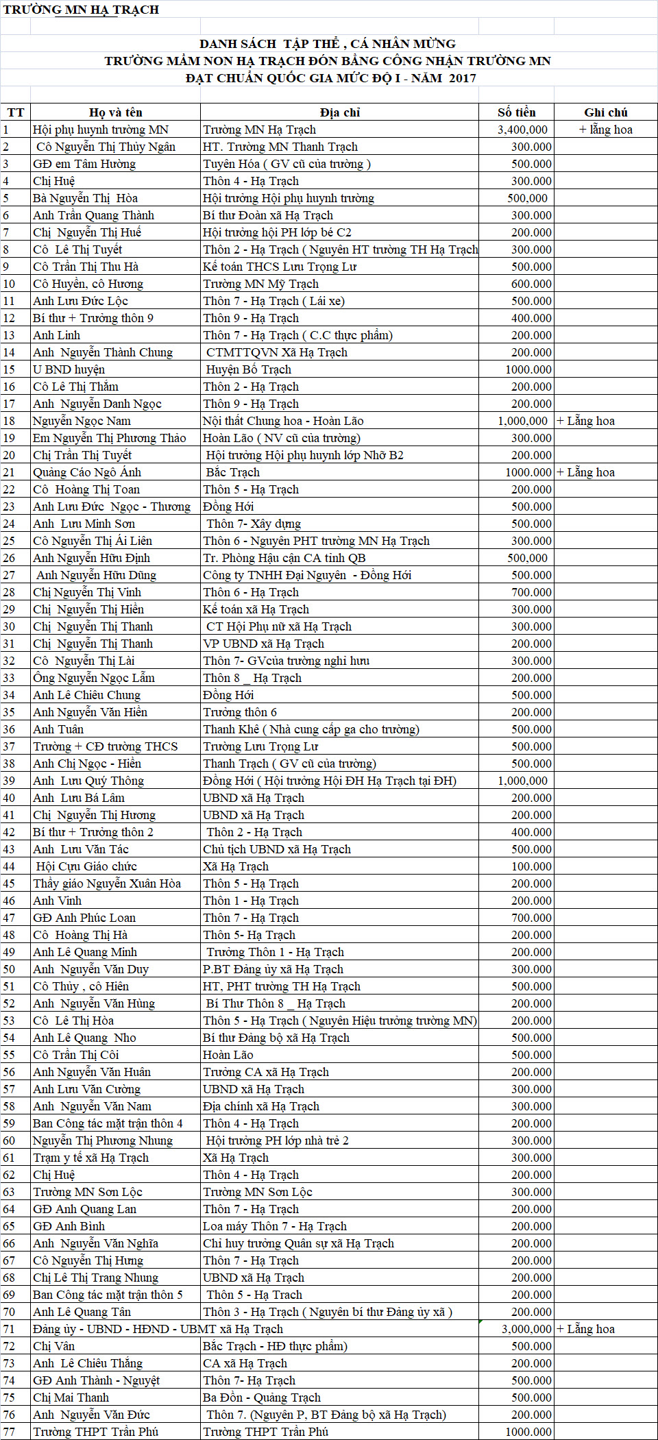 Danh sách tập thể và cá nhân ủng hộ nhà trường trước ngày lễ vui lòng xem tại đây http://caolaoha.com/?language=vi&nv=news&op=Hoat-dong-khuyen-hoc/Danh-sach-cac-tap-the-ca-nhan-ung-ho-truong-Mam-non-Ha-Trach-2158